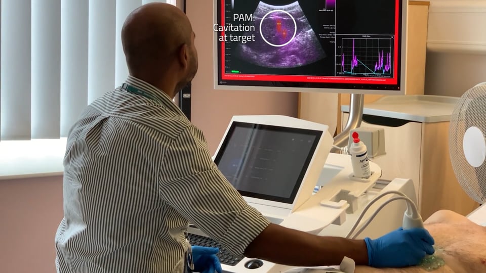 Solid tumours represent a major barrier to drug delivery, particularly for next-generation macromolecular therapeutics such as immuno-oncology antibodies and oncolytic viruses. The CEeDD clinical trial aims to test for the first time in patients whether a technology initially developed within the IBME and licensed and clinically translated by University spin-out OxSonics Therapeutics can help increase the delivery, penetration and efficacy of standard-of-care drug treatments for metastatic colorectal cancer (mCRC) in the liver. The novel treatment consists of an infusion of proprietary solid gas-stabilizing cavitation nuclei (the SonoTran particles) alongside the standard combination of FOLFIRI chemothery and Cetuximab antibodies in KRAS-wildtype mCRC patients, following which the liver is targeted using a novel handheld ultrasound device (the SonoTran system). Under the influence of targeted focused ultrasound, the circulating SonoTran particles are activated to enhance transport and penetration of the therapeutic agents into targeted tumours visible on conventional ultrasound imaging. The drug delivery process is monitored in real time using Passive Acoustic Mapping, an innovative technique also developed within the IBME.